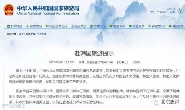 △国家旅游局发出的唯一官方文件是提醒国人,韩国游要谨慎出行