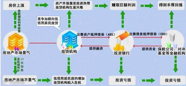 上面A,B,C,D,E,F....都在赚大钱,从根本上说,这些钱来自A以及同A相仿的投资人的盈利。而他们的盈利大半来自美国的次级贷款。次贷主要是给了普通的美国房产投资人。这些人的经济实力本来只够买自己的一套住房,但是看到房价快速上涨,动起了房产投机的主意。他们把自己的房子抵押出去,贷款买投资房。这类贷款利息要在8%-9%以上,凭他们自己的收入很难对付,不过他们可以继续把房子抵押给银行,借钱付利息,空手套白狼。此时A很高兴,他的投资在为他赚钱;B也很高兴,市场违约率很低,保险生意可以继续做;后面的C,D,E,F等等都跟着赚钱。