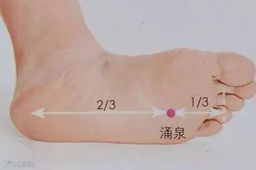 涌泉穴,在足底的前1/3处(计算时不包括足趾)。这个穴位比较敏感,不要用太大的力度,稍有感觉即可。以边按边揉为佳,持续5分钟左右即可。