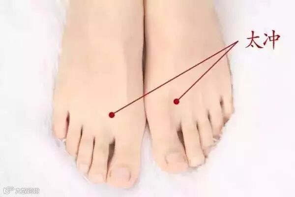 这是指太冲穴,位置在足背第一、二跖骨结合部之前的凹陷中。用拇指按揉3~5分钟,感觉轻微酸胀即可。不要用太大的力气,两只脚交替按压。