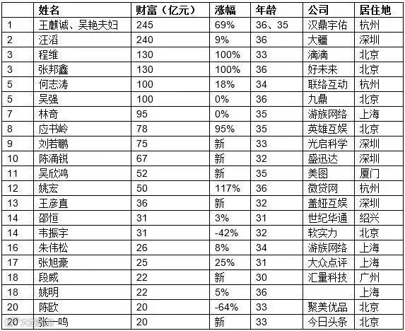 胡润研究院10月31日发布《2016胡润80后富豪榜》,这是胡润研究院首次发布此榜单,内容包括《80后白手起家富豪榜》和《80后财富继承富豪榜》,榜单财富计算的截止日期为今年8月15日。