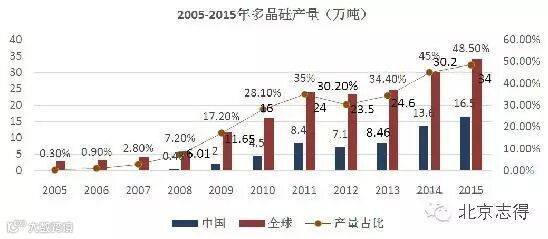 2015年,中国多晶硅产量16.5万吨,占全球总产量34万吨的48.5%;硅片产量48GW,占全球总产量60.3GW的79.6%;电池片产量41GW,占全球总产量65.5GW的62.6%;电池组件产量达到45.8GW,占全球总产量60.2GW的76.1%。