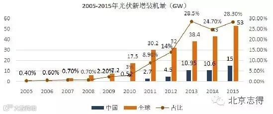 2015年,中国新增光伏装机量15GW,同比增长41.5%,占全球新增装机量53GW的28.3%,连续第三年位居全球新增光伏装机量第一位。