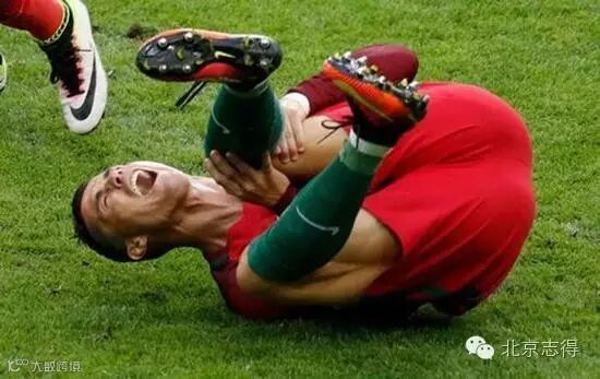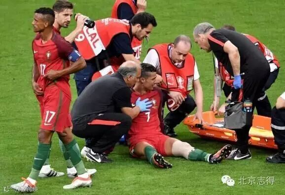 赛前谁都无法预料的这一幕,葡萄牙当家球星克里斯蒂亚诺·罗纳尔多开场仅25分钟就受伤离场!比赛开始后不久,C罗在中场受到法国球星帕耶的侵犯,左腿膝盖被顶到,他当时痛苦的倒在地上,感觉已经不妙。虽然经过治疗,左膝缠上绷带的C罗又回到场上,但结果证明,这最后的努力依然是徒劳的。担架入场,将C罗抬出场地。此时,法兰西大球场的葡萄牙球迷集体起立鼓掌,向他们的英雄C罗致敬。半场结束,比分0比0葡萄牙队顶住了法国队的猛烈进攻。