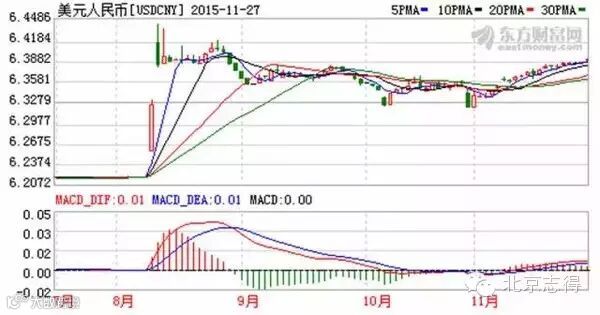 上图:美元对人民币汇率,上升代表人民币贬值,左侧出现的跳空缺口,就是8月人民币连续贬值的那三天的行情。可看出,最近一个时期,人民币一直在小幅贬值。