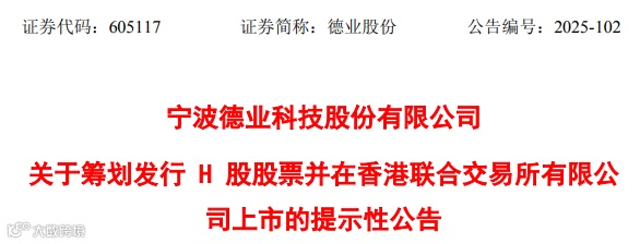 来自浙江宁波的A股上市公司德业股份(605117.SH)发布公告称,为进一步推进公司全球化发展战略,提升公司品牌国际影响力与核心竞争力,积极借助国际资本市场拓宽多元融资渠道,以全面提升公司治理水平,正在筹划发行境外股份(H股)并在港交所上市事宜。