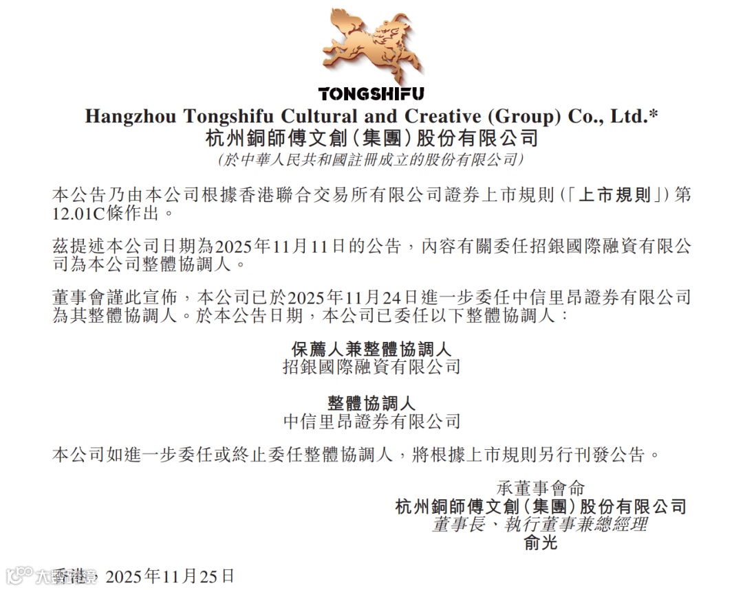 据港交所11月25日披露,杭州铜师傅文创(集团)股份有限公司进一步委任中信里昂证券有限公司为整体协调人。此前,铜师傅已向港交所主板提交上市申请,招银国际为独家保荐人。
