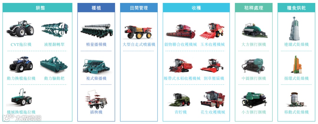 农机具。公司拓展农机具的广泛产品线,涵盖耕整、种植、田间管理、秸秆处理和粮食烘干等领域,为多种农机之间的协同作业效应奠定了坚实基础。公司的核心产品包括高速精量播种机、复式条播机、高密度大方捆、自走式喷雾机、400T连续式干燥机等。