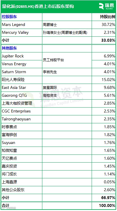 招股书显示,量化派在香港上市后的股东架构中,周灏博士、孙靖淮女士夫妇,合计持股约33.03%,为控股股东;其他投资者包括阳光人寿保险、复星国际、高榕资本等。其他公众股东持股2.6%。