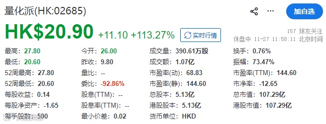 量化派是次IPO全球发售1,334.75万股(占发行完成后总股份的2.6%),每股上限定价9.80港元,募集资金总额约1.31亿港元,募资净额约1,237万港元。