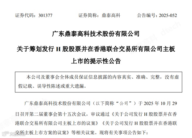 来自广东东莞的A股上市公司鼎泰高科(301377.SZ)发布公告称,为深化公司全球化战略布局,推进国际化平台建设,增强综合竞争力,实现高质量可持续发展,经充分研究论证,公司拟公开发行境外上市外资股(H股)股票并在香港联合交易所有限公司主板挂牌上市。公司将充分考虑现有股东的利益和境内外资本市场的情况,在股东会决议有效期内(即经公司股东会审议通过之日起24 个月或同意延长的其他期限)选择适当的时机和发行窗口完成本次发行上市。