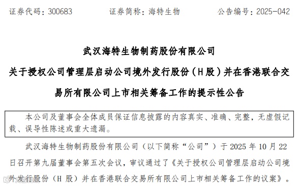 来自湖北武汉的A股上市公司海特生物(300683.SZ)发布公告称,为深化公司全球化战略布局,加快海外业务发展,提升公司国际化品牌形象,同时打造多元化资本运作平台,增强公司的境外融资能力,助力公司高质量发展,根据公司总体发展战略及运营需要,公司拟在境外发行股份(H股)并在港交所上市。