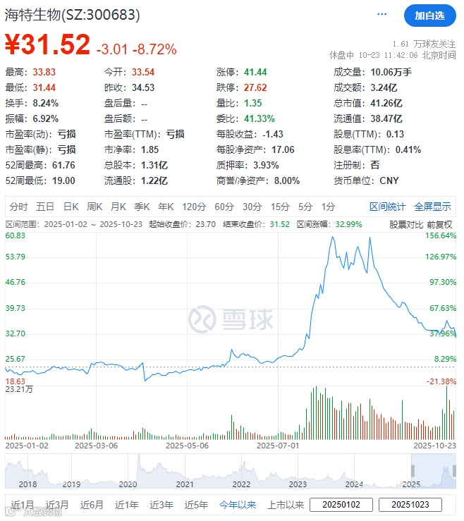 海特生物(300683.SZ)于2017年8月8日在深交所挂牌上市,截至午间收市(2025年10月23日)其总市值约41.26亿元人民币。