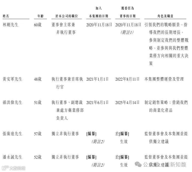 林刚先生,60岁,公司的董事会主席、非执行董事兼控股股东。林先生是CMS集团的主席、首席执行官兼总裁,并於2006年12月18日获委任為CMS的董事。其於2020年11月18日获委任為董事,并於2025年4月14日获调任為非执行董事。林刚先生是CMS集团的创始人,林先生负责制定、实施及管理CMS集团的发展战略及增长策略,以及管理CMS集团的整体运营。林先生拥有临床经验,并对中国医药行业有深刻的理解和知识,在研发、营销、推广及销售等方面具有独特的洞察力和丰富的经验。他於1986年7月获得湛江医学院(现称广东医科大学)的医学学士学位。