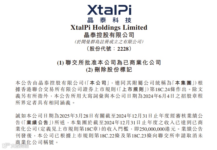 上市不足一年的特专科技公司晶泰控股-P(02228.HK)公布,已获联交所批准,公司将不再被视为未商业化公司,而将被视为已商业化公司。在获批准后,公司的英文及中文股份简称将不再印有「P」标记。公司股份将以新英文股份简称「XTALPI」及中文股份简称「晶泰控股」于联交所买卖,取代现有英文股份简称「XTALPI-P」及中文股份简称「晶泰控股-P」, 自2025年4月9日(周三)上午九时正起生效,股份代号「02228」将维持不变。