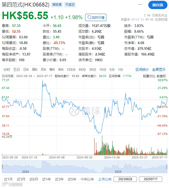 第四范式,于2023年9月28日在港交所主板上市,当时以每股55.60港元、发行2,019.42万股H股,IPO募资11.228亿港元。截至午间(7月17日)收市,其收报每股56.55港元,目前市值约278.95亿港元。
