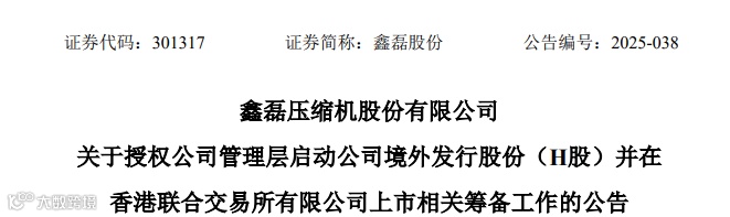 来自浙江台州温岭的A股上市公司鑫磊股份(301317.SZ)公告称,为加快推进公司全球化战略布局,提升国际品牌形象,增强综合竞争力,助力公司长远发展,公司拟在境外发行股份(H股)并在港交所上市,公司董事会授权公司管理层启动本次H股上市的前期筹备工作。