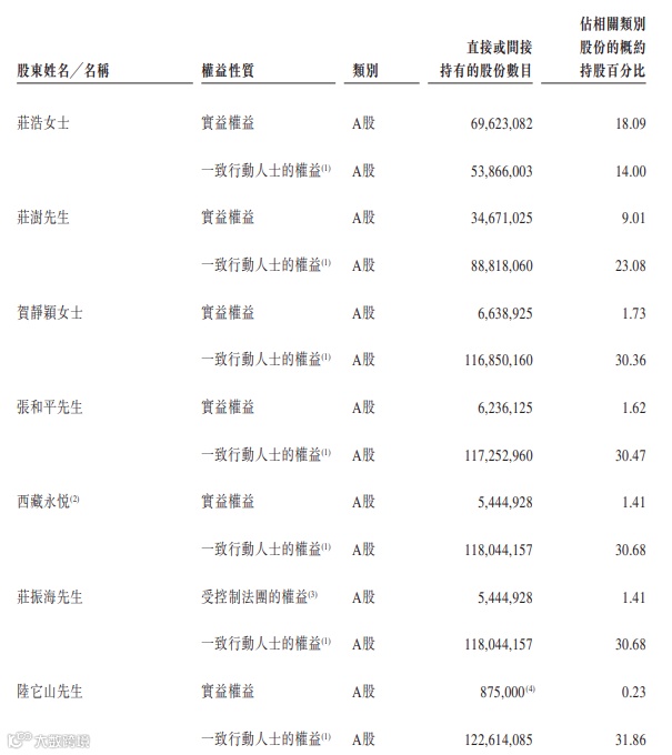 其中,庄浩、庄澍、贺静颖、张和平、庄振海、陆它山及西藏永悦为一致行动人士;