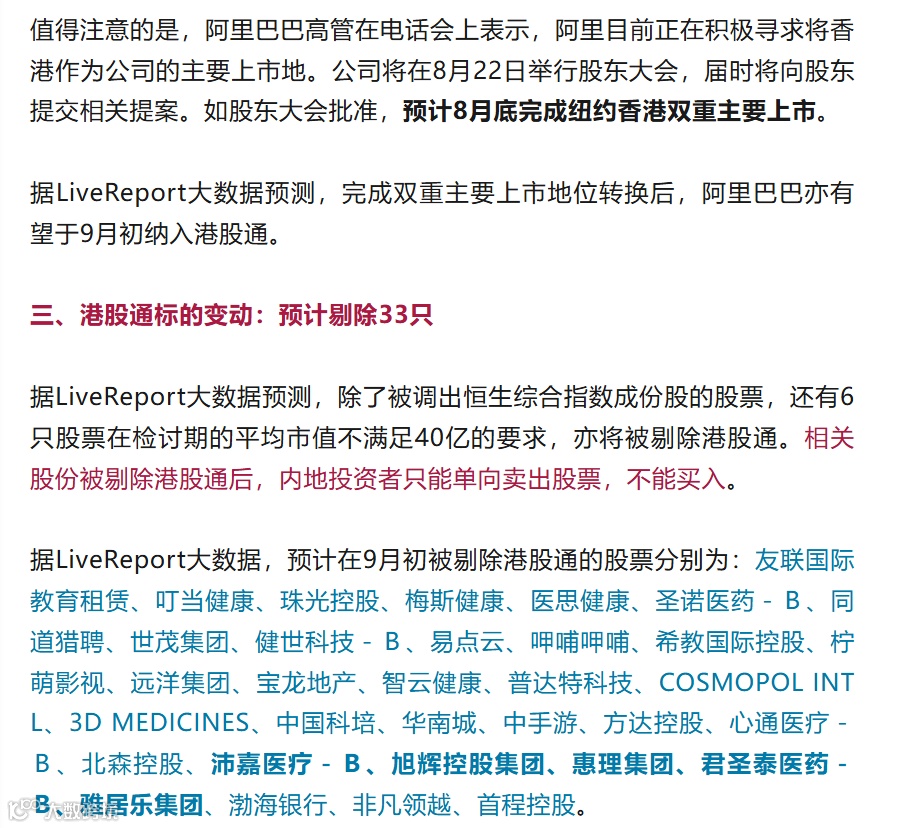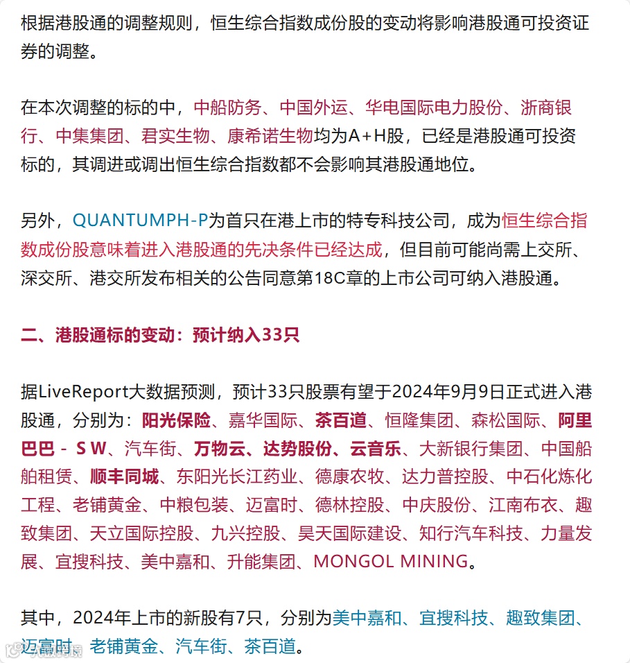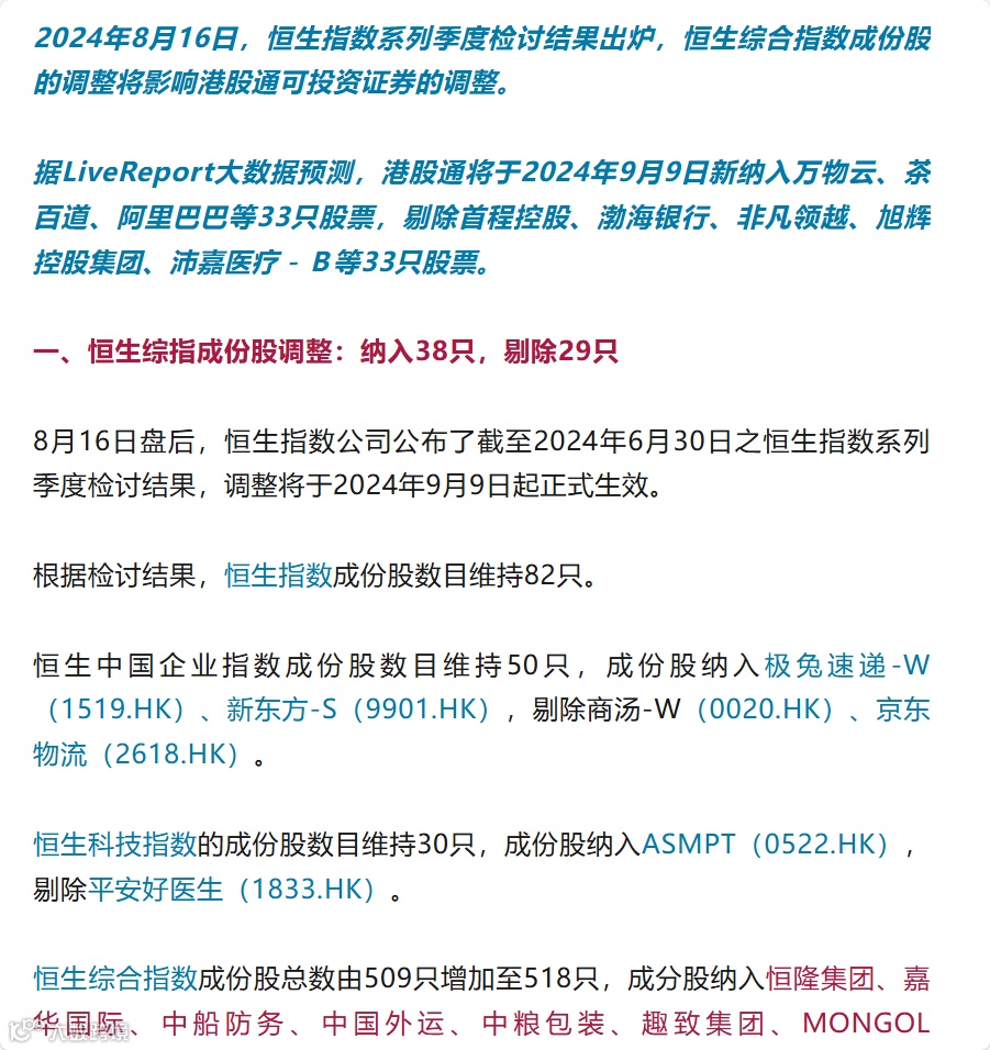 恒指季检结果出炉!万物云、顺丰同城、阿里巴巴等33股即将纳入港股通,首程控股等33股或遭剔除