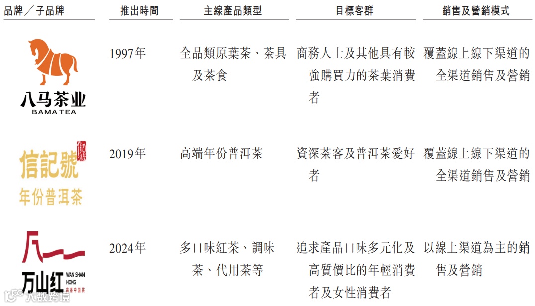公司拥有覆盖中国主要的六大茶类的全品类茶产品体系的核心品牌八马。公司的信记号子品牌专注提供高端年份普洱茶,而万山红子品牌则专注于提供迎合追求口味多元化及高质价比的年轻消费者及女性消费者的产品。