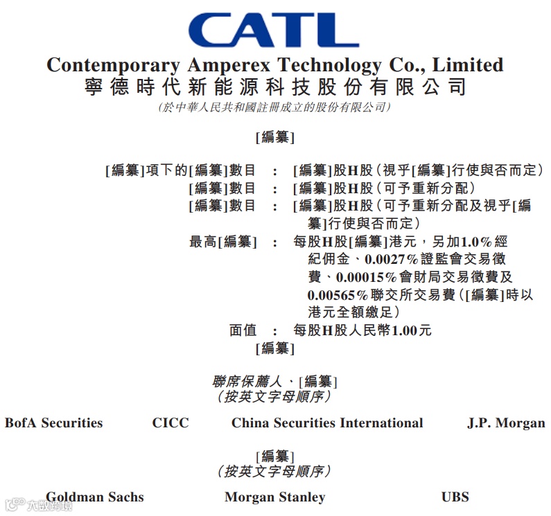 据港交所5月6日披露,宁德时代新能源科技股份有限公司通过港交所主板上市聆讯,保荐人兼整体协调人包括美银、中金公司、中信建投国际、摩根大通、高盛、摩根士丹利、UBS。
