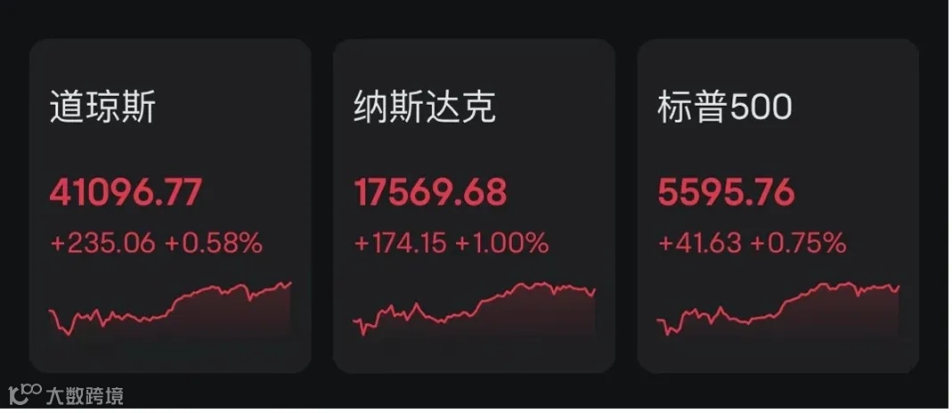 当地时间周四,美股三大指数全线上涨。截至收盘,道指上涨235.06点,至41096.77点,涨幅0.58%;标普500指数上涨41.63点,至5595.76点,涨幅0.75%;纳斯达克指数上涨174.15点,至17569.68点,涨幅1.00%。标普500指数、纳指均录得四连涨。