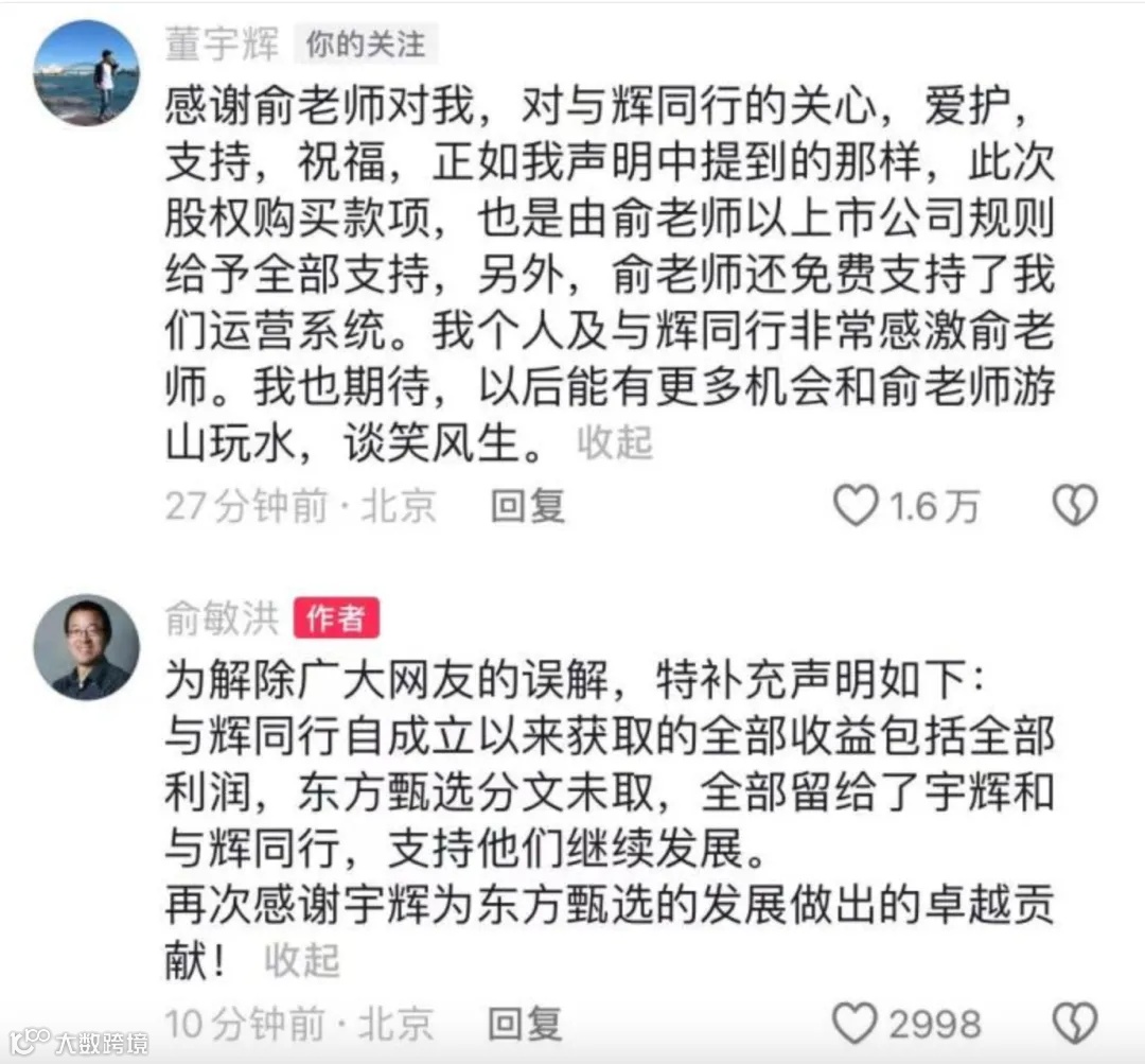对此,董宇辉回应称:“感谢俞老师对我,对与辉同行的关心,爱护支持,祝福,正如我声明中提到的那样,此次股权购买款项,也是由俞老师以上市公司规则给予全部支持,另外,俞老师还免费支持了我们运营系统。我个人及与辉同行非常感激俞老师。我也期待,以后能有更多机会和俞老师游山玩水,谈笑风生。”