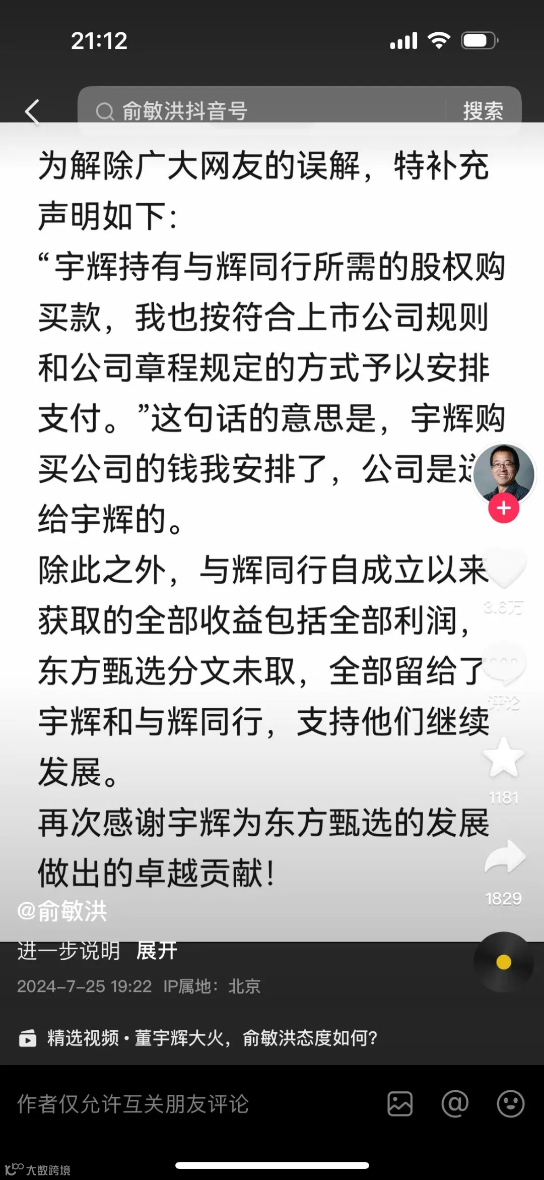 俞敏洪在抖音强调:“宇辉持有与辉同行所需的股权购买款,我也按符合上市公司规则和公司章程规定的方式予以安排支付。这句话的意思是,宇辉购买公司的钱我安排了,公司是送给宇辉的。”