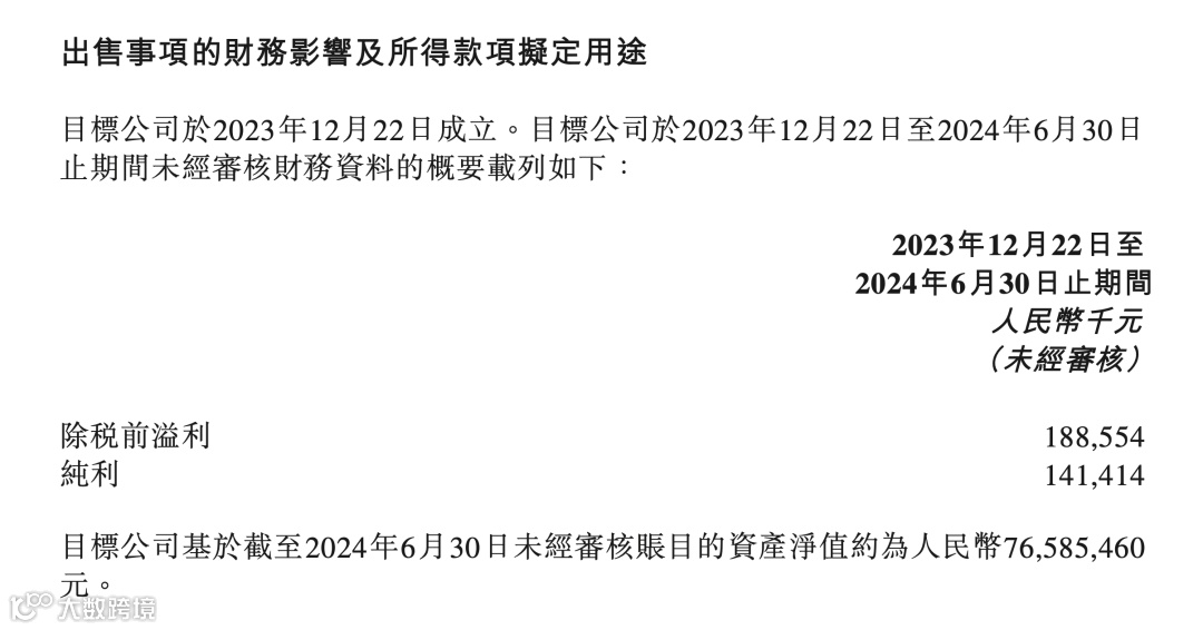 公告显示,与辉同行自2023年12月22日成立至2024年6月30日期间,实现未经审核除税前溢利约为1.89亿元(人民币,下同);纯利约为1.41亿元。截至2024年6月30日未经审核账目的资产净值约为7658.546万元。