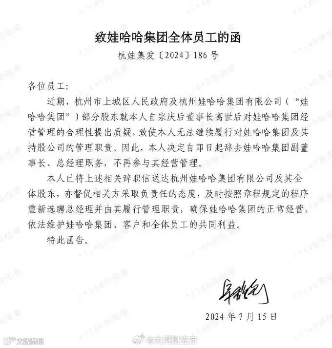 7月18日上午,一份《致娃哈哈集团全体员工的函》近日在网上流传,其中提及宗馥莉“决定从即日起辞去娃哈哈集团副董事长、总经理职务,不再参与其经营管理”。
