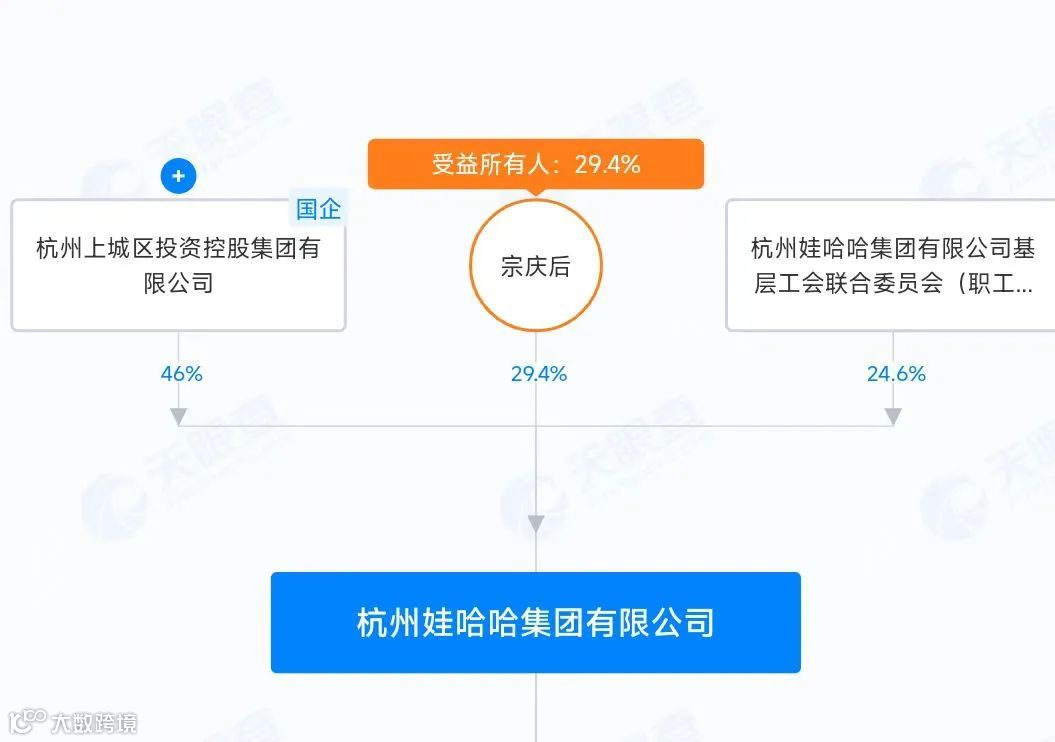 据21世纪经济报道记者观察,从股权结构看,娃哈哈集团目前有三方股东,第一大股东杭州上城区文商旅投资控股集团有限公司,持股46%,该公司由杭州上城区国资实控;第二大股东宗庆后持股29.40%;此外,娃哈哈集团基层工会联合委员会持股24.60%。