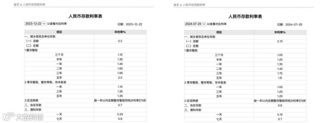 (工商银行最近两次存款利率对比,左为2023年12月22日,右为2024年7月25日)