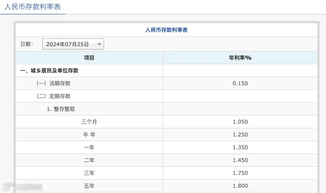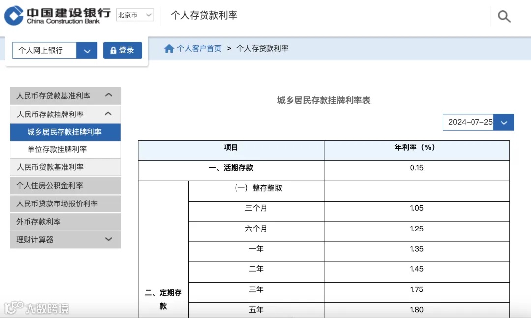 工商银行网站信息显示,自7月25日起,执行最新人民币存款利率:整存整取三个月、半年、一年、二年、三年、五年的利率分别为1.05%、1.25%、1.35%、1.45%、1.75%和1.8%。