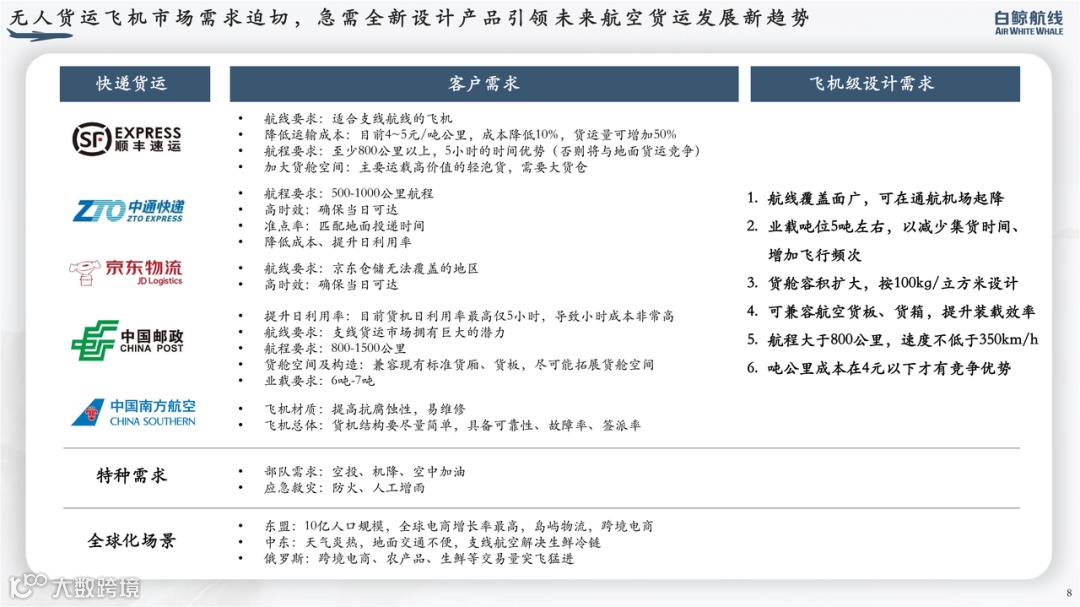 最后,胡震东强调了飞机的国产自主可控性,包括动力系统在内,全部采用国产部件,以规避国际市场的不确定性。他还分享了公司的未来发展愿景,除了飞机制造外,公司还将提供全面的运营支持服务,包括维修、维护、保养和备品备件等,强化了无人机产品的服务属性。通过深入了解客户需求和优化运营成本,白鲸航线正积极为未来的航空货运市场提供高效、低成本的解决方案。