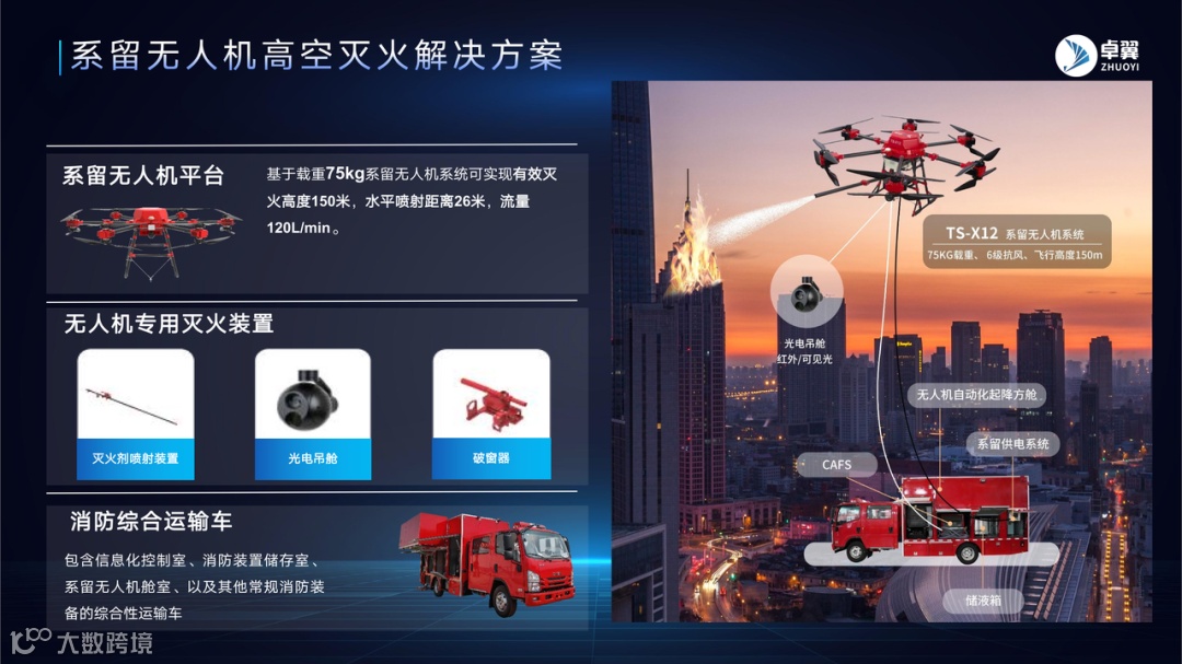 无人机高层灭火及自然灾害应急响应:卓翼智能提出系留无人机高空灭火解决方案,方案集成大载荷系留无人机平台、无人机专用高效灭火装置和专用消防运输车辆。当综合消防保障车抵达火场后,TS-X12型系留无人机可在5分钟内实现快速升空,随后地面人员可通过无人机搭载的高清摄像头和热成像测温实时监控火情,并通过其挂载的光电吊舱、消防水带和专用喷射装置,实现高空持续精准灭火,有效填补在百米以上高空灭火应急救援的空白。该方案具备:长时间不间断作业、高度集成快速部署、军规级安全可靠、精准打击、高效灭火等优势,并已在多次实战演练中得到验证。同时,公司还针对自然灾害应急响应开发了无人机解决方案,包括森林消防、夜间照明支持、应急通讯和物资投送等。在灾后通讯保障方面,无人机展现出快速部署和高效运作的能力。