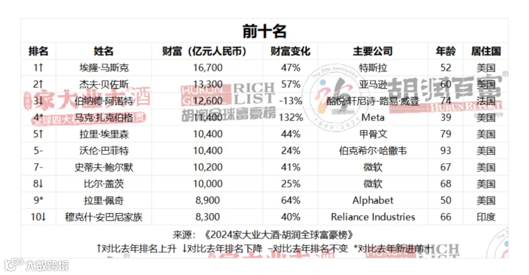 榜单中,有3279位十亿美元以上资产的企业家上榜,较去年榜单增加167位,总财富额较去年榜单增长9%。其中,52岁的埃隆·马斯克以1.67万亿元人民币的财富重登首富宝座。农夫山泉创始人钟睒睒以4500亿元身价连续第四次成为中国首富。