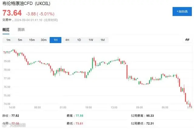 截至当日收盘,WTI 10月原油期货收跌3.21美元,跌幅4.36%,报70.34美元/桶,逼近1月8日收盘位69.99美元。布伦特11月原油期货收跌3.77美元,跌幅4.86%,报73.75美元/桶。