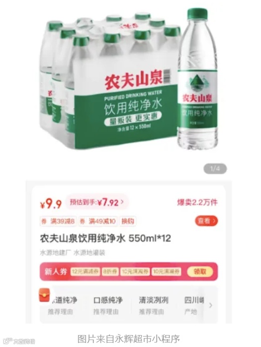 如通过永辉超市的线上小程序渠道,农夫山泉绿瓶纯净水叠加优惠券后,价格甚至可以低至7.92元/件,单瓶低至0.66元。