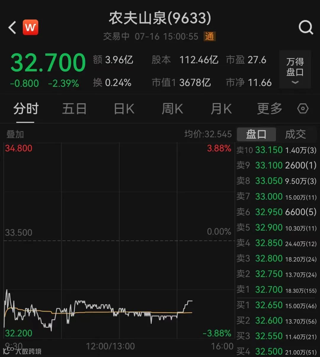 7月15日,农夫山泉股价低开低走,收盘跌4.56%,截至7月16日收盘,农夫山泉跌2.39%,报32.7港元/股,最新市值为3678亿港元,这两个月总市值没了超1000亿港元。