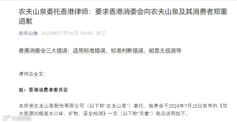 7月16日上午,农夫山泉(09633.HK)在其官方公众号发文声明,指出香港消费者委员会(简称“香港消委会”)针对公司产品溴酸盐含量情况做出了不客观的评价,认为其存在“适用标准错误、标准判断错误、明显主观误导”等三大错误,要求香港消委会向农夫山泉及其消费者郑重道歉,并附上律师函。