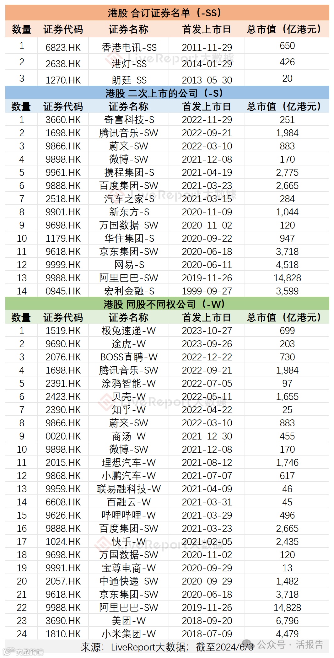 后缀-SW:第二上市+同股不同权的上市公司