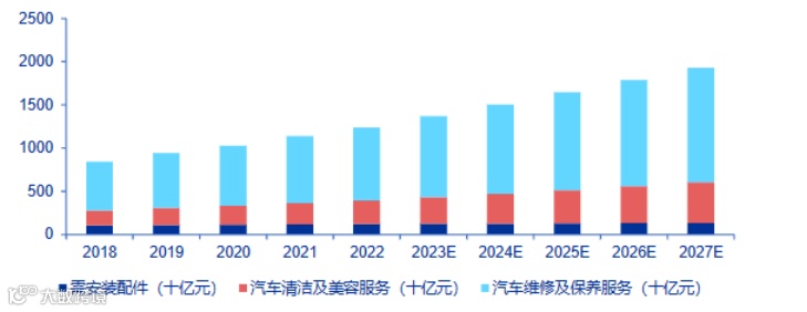 2018-2027E中国汽车服务市场主要服务的市场规模及预测 图片来源:申万宏源