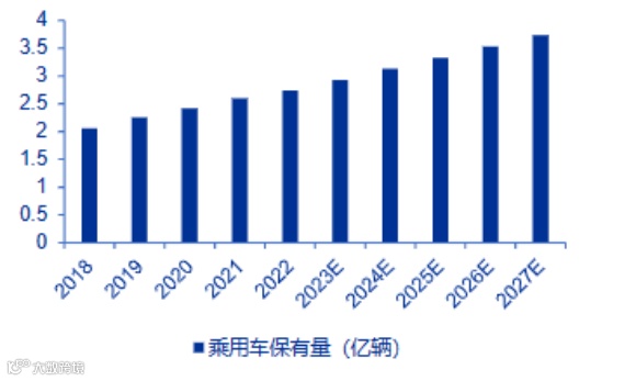 2018-2027E中国乘用车保有量规模及预测 图片来源:申万宏源