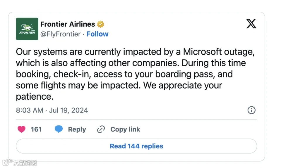 据路透社周五报道,微软云服务故障甚至导致了一些航空公司暂停航班运营。特别是美国边疆航空公司,其系统直接受到了微软服务中断的影响。该公司随后发布声明称:“在此期间,预订、办理登机手续、获取登机牌以及部分航班可能会受到影响。”