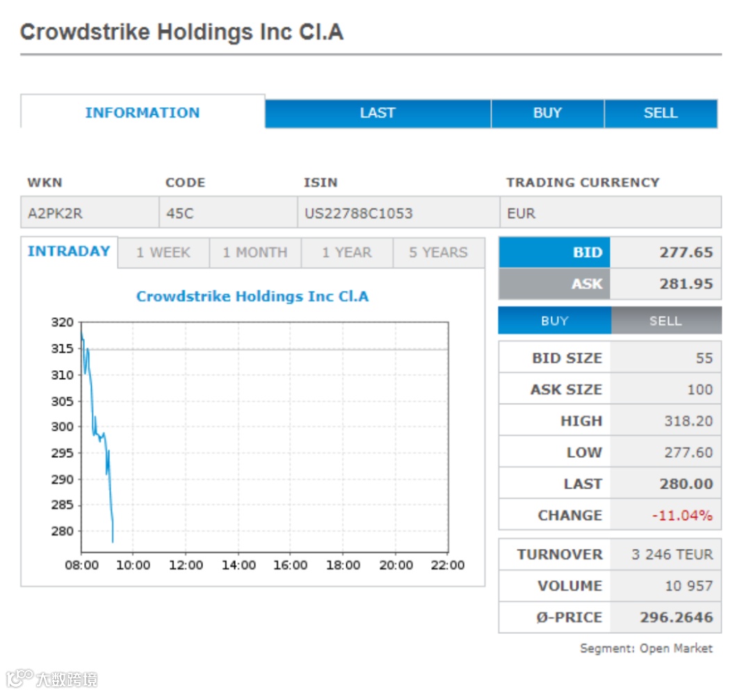 股价方面,Crowdstrike Holdings Inc在德国Tradegate交易平台下跌超11%。