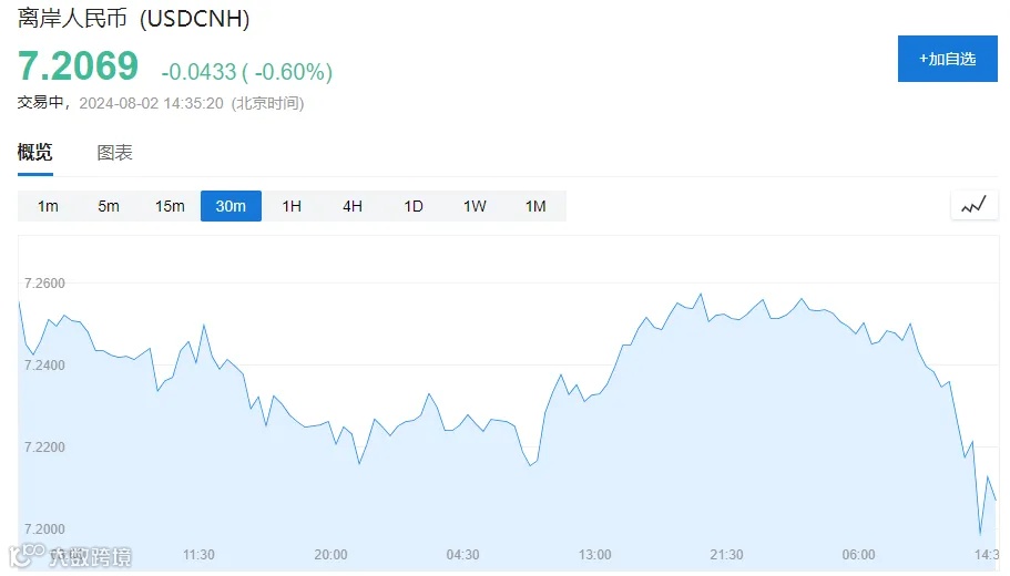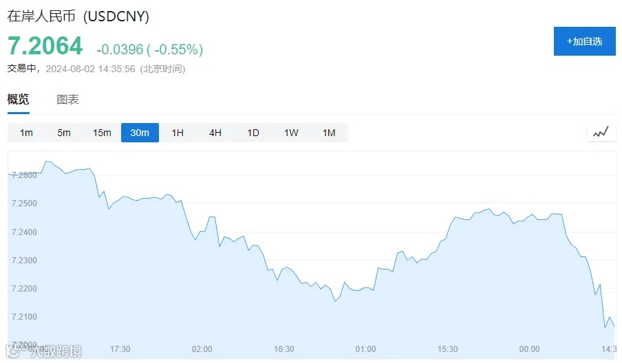 8月2日,在岸、离岸人民币对美元汇率突然拉升超400点,双双升破7.20关口。