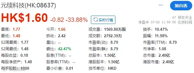 截至午间收市,元续科技每股报1.60港元,总市值约2.30亿港元。