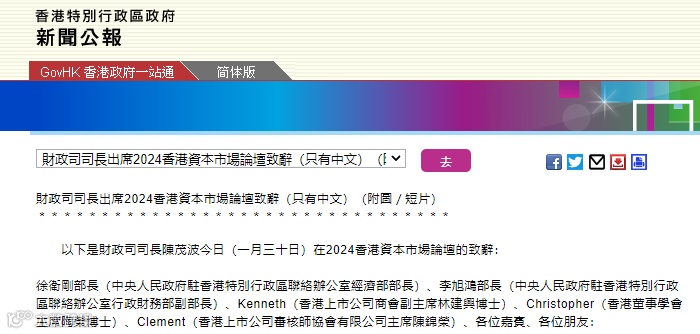 以下是财政司司长陈茂波今日(一月三十日)在2024香港资本市场论坛的致辞: