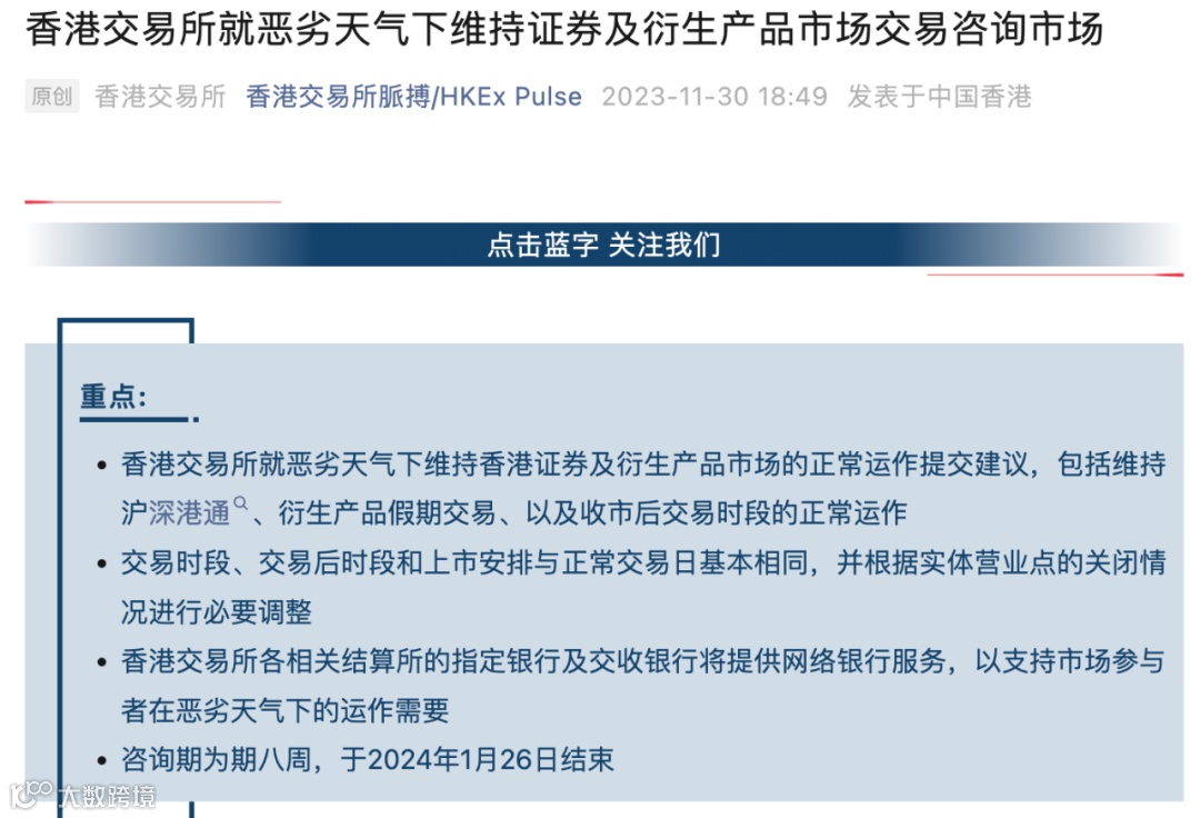 根据公告,港交所此次咨询,是就香港行政长官于2023年施政报告,及香港财政司司长于2023-2024年度财政预算案演辞中提及的“恶劣天气下维持交易”征求公众意见,目的是在恶劣天气下维持香港证券及衍生产品市场的正常运作。