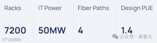机架容量7200,IT Power50兆瓦,能量使用效率1.4。